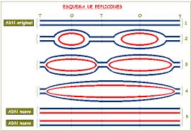 Este proceso que acabamos de ver, comienza en varios puntos fijos del genoma al mismo tiempo, y son los llamados "orígenes de replicación". En estos puntos, la dos hebras se separan ya que deben duplicarse al mismo tiempo y se forman "burbujas de replicación" cada una conteniendo dos horquillas, una a la derecha y otra a la izquierda.